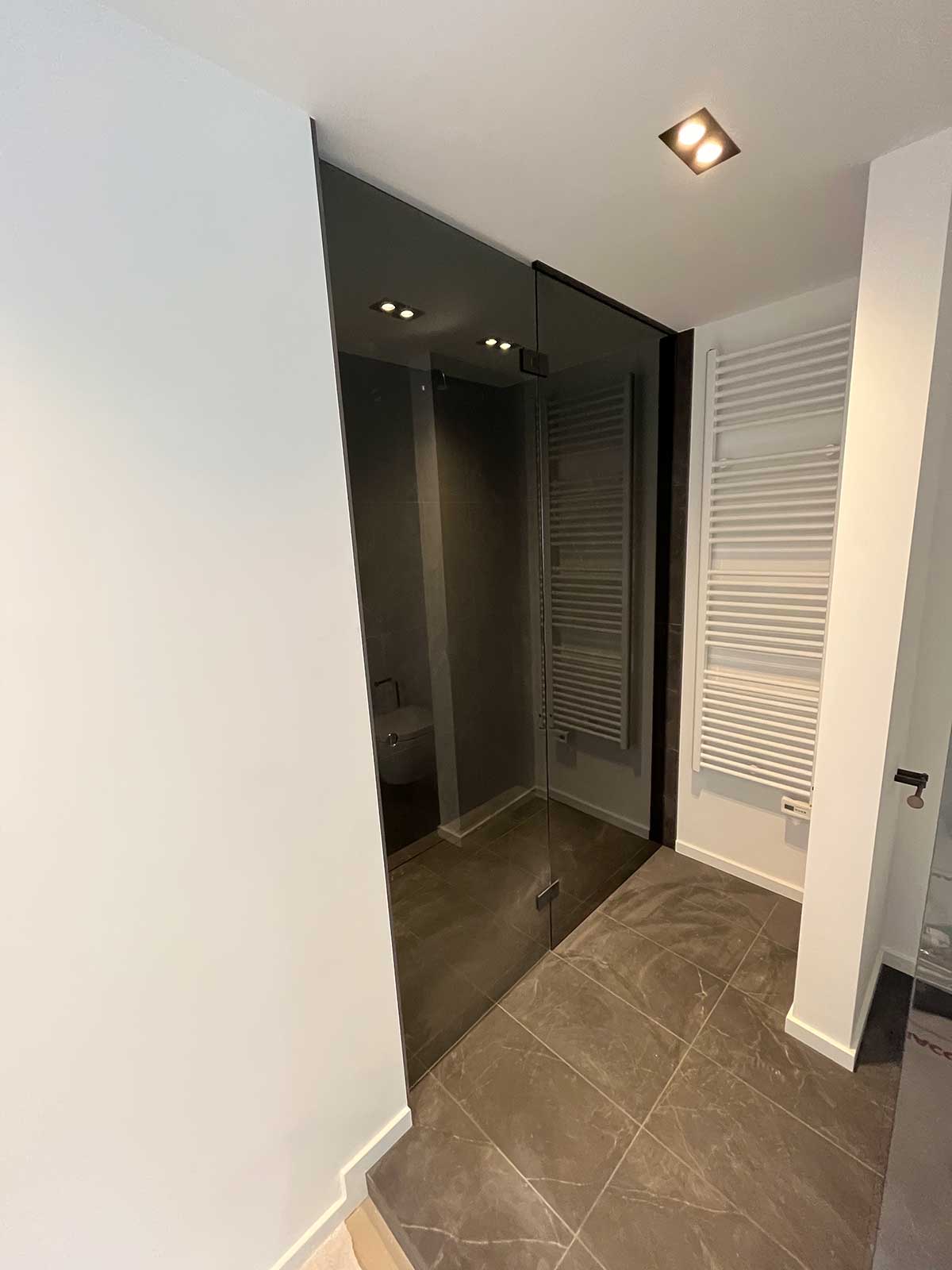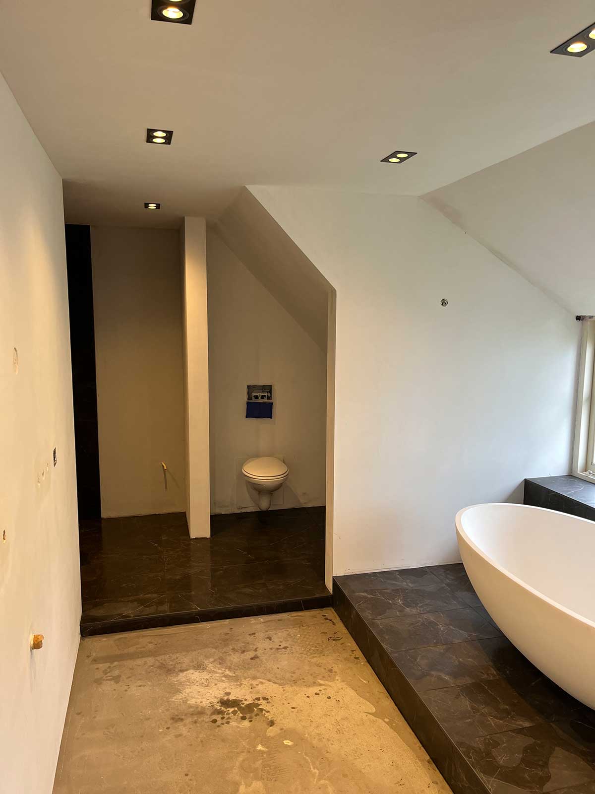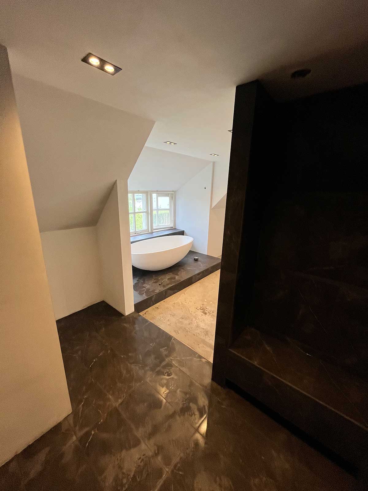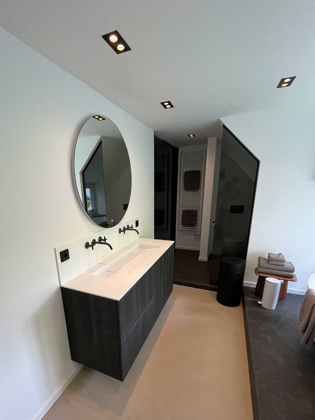 Badkamer gerenoveerd en vergroot, elektrische vloerverwarming en beton Cire op de vloer