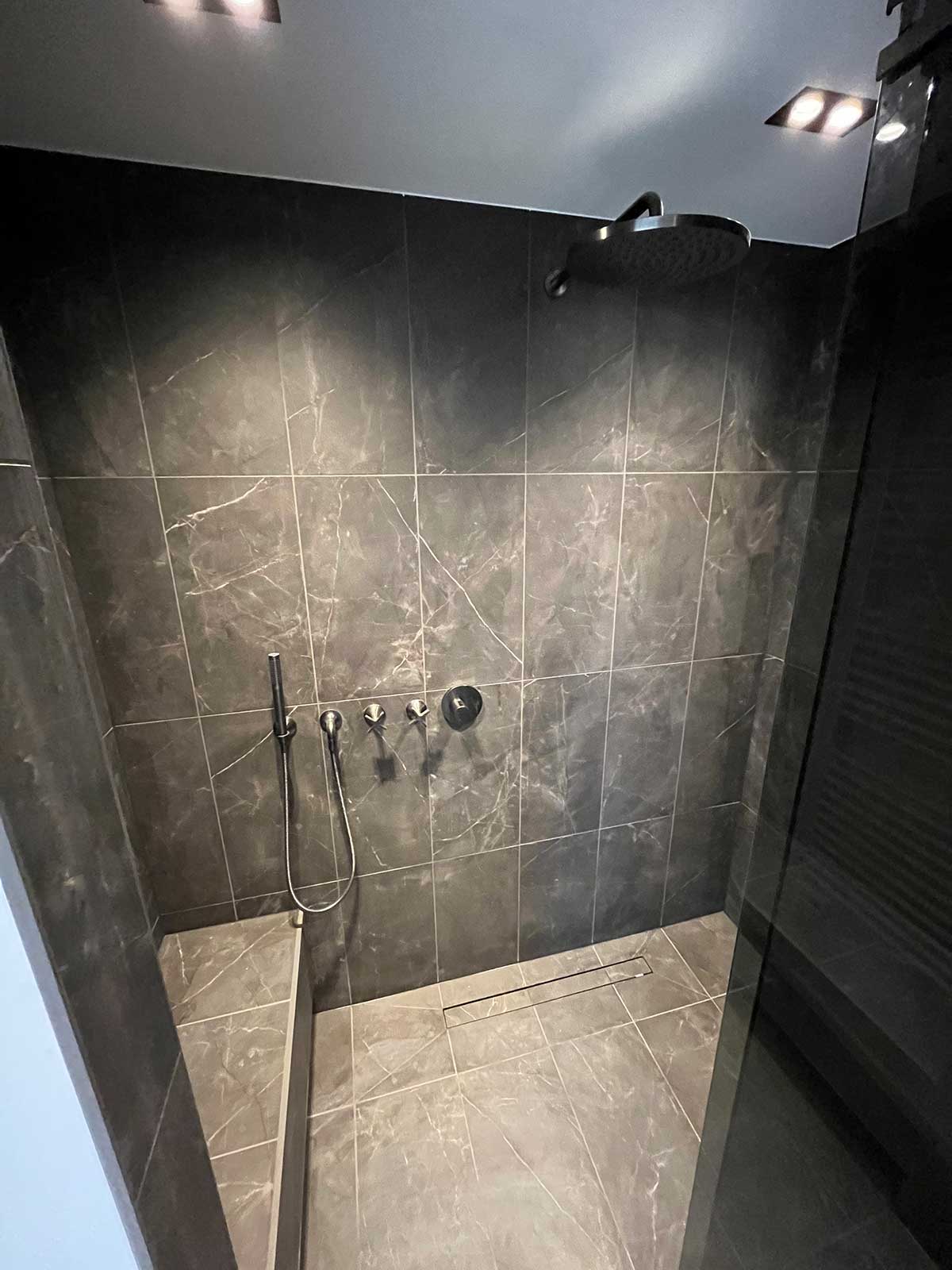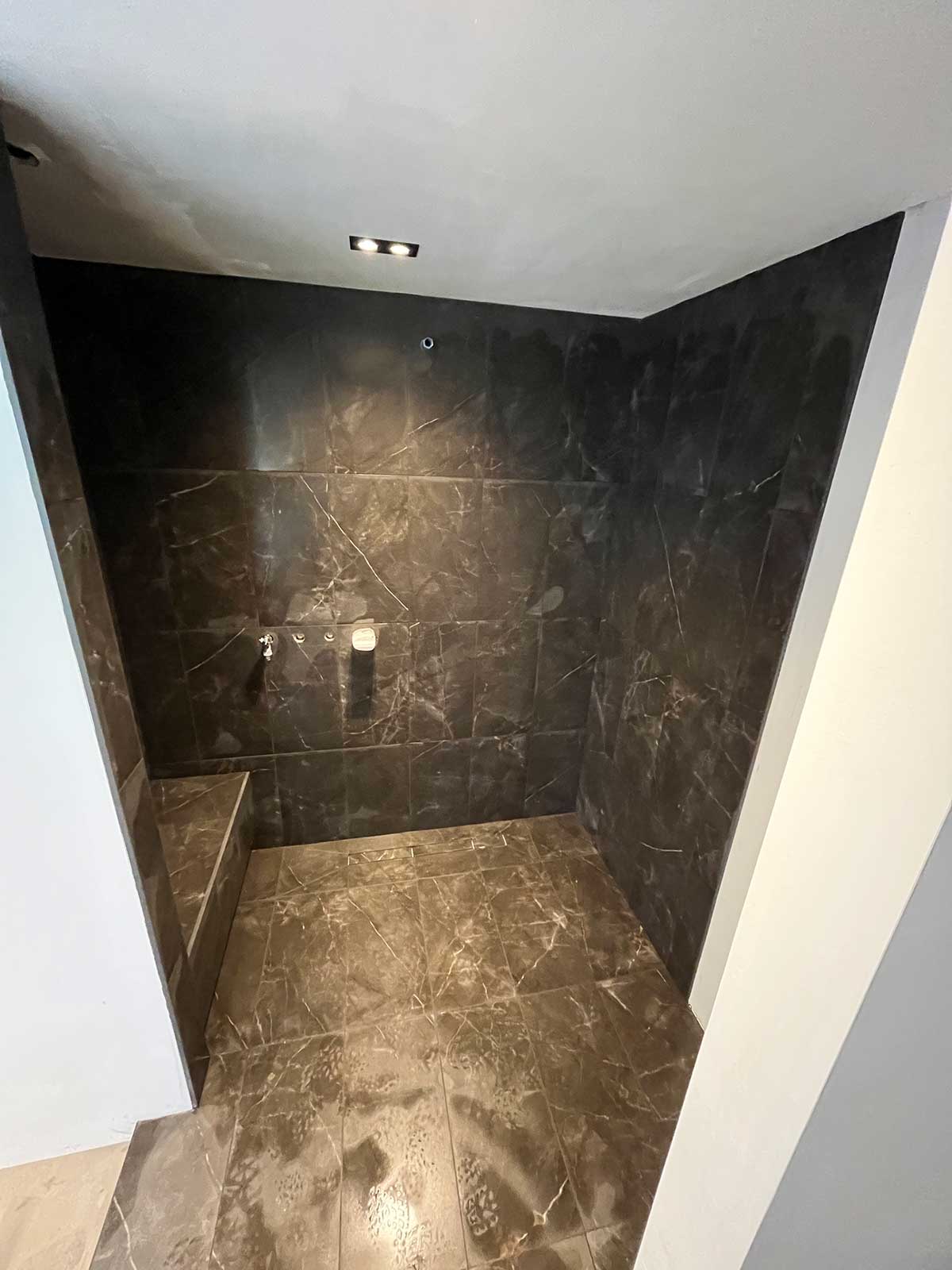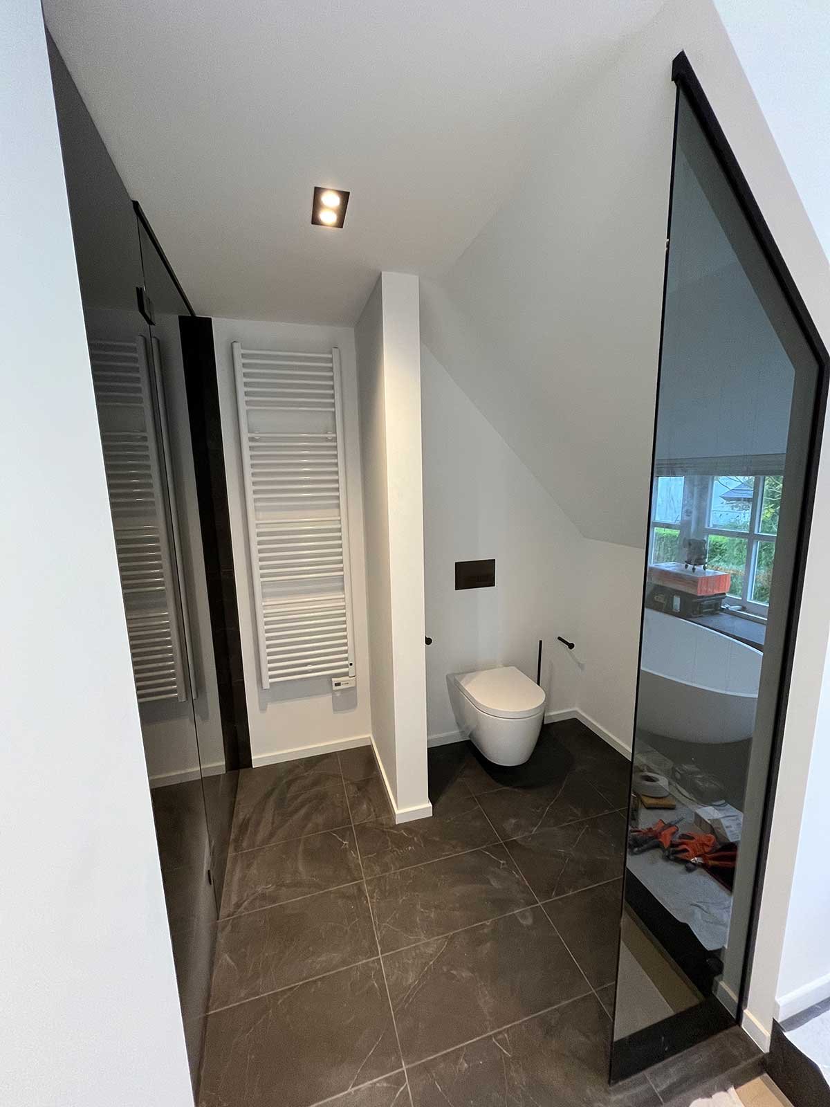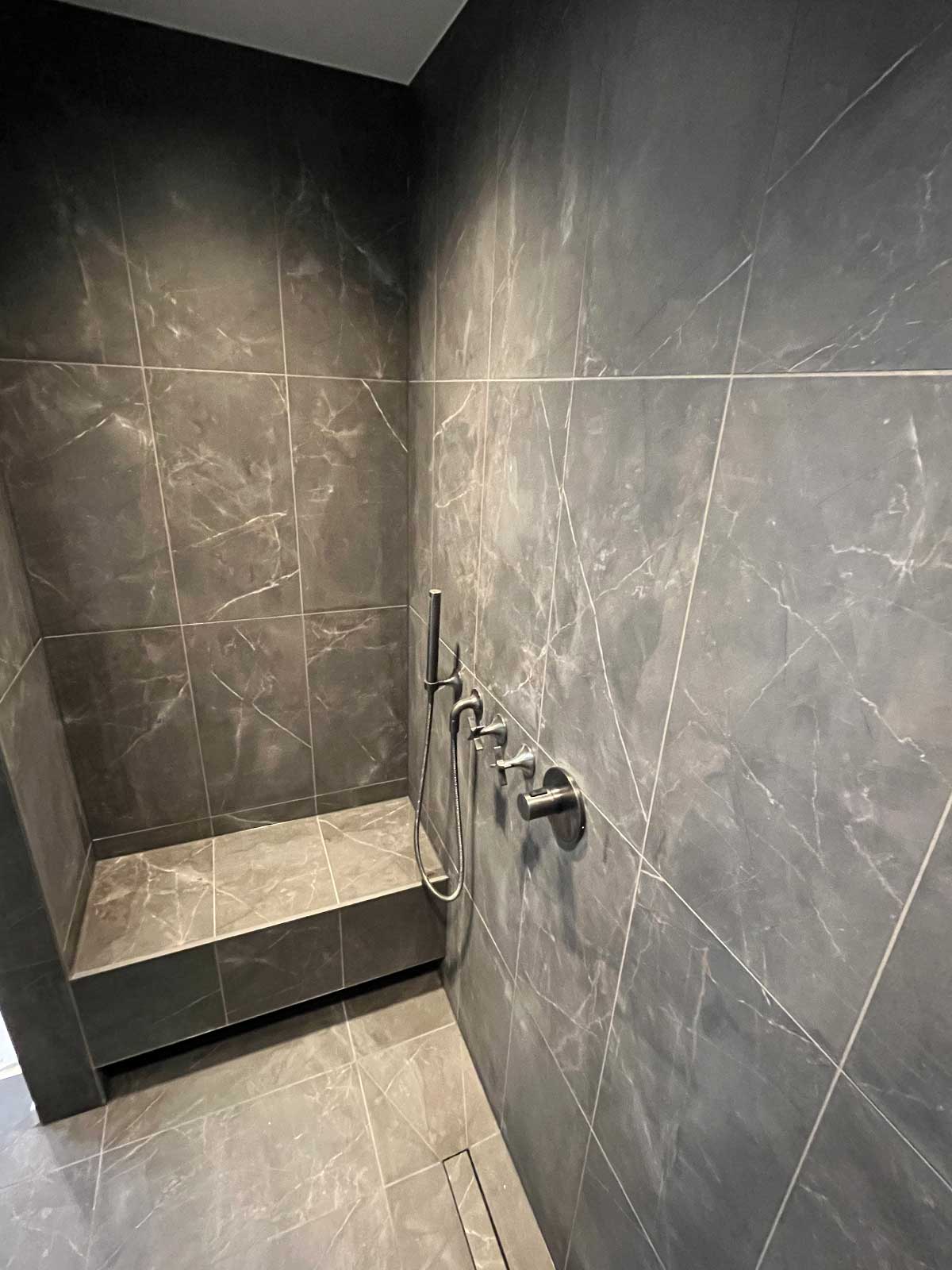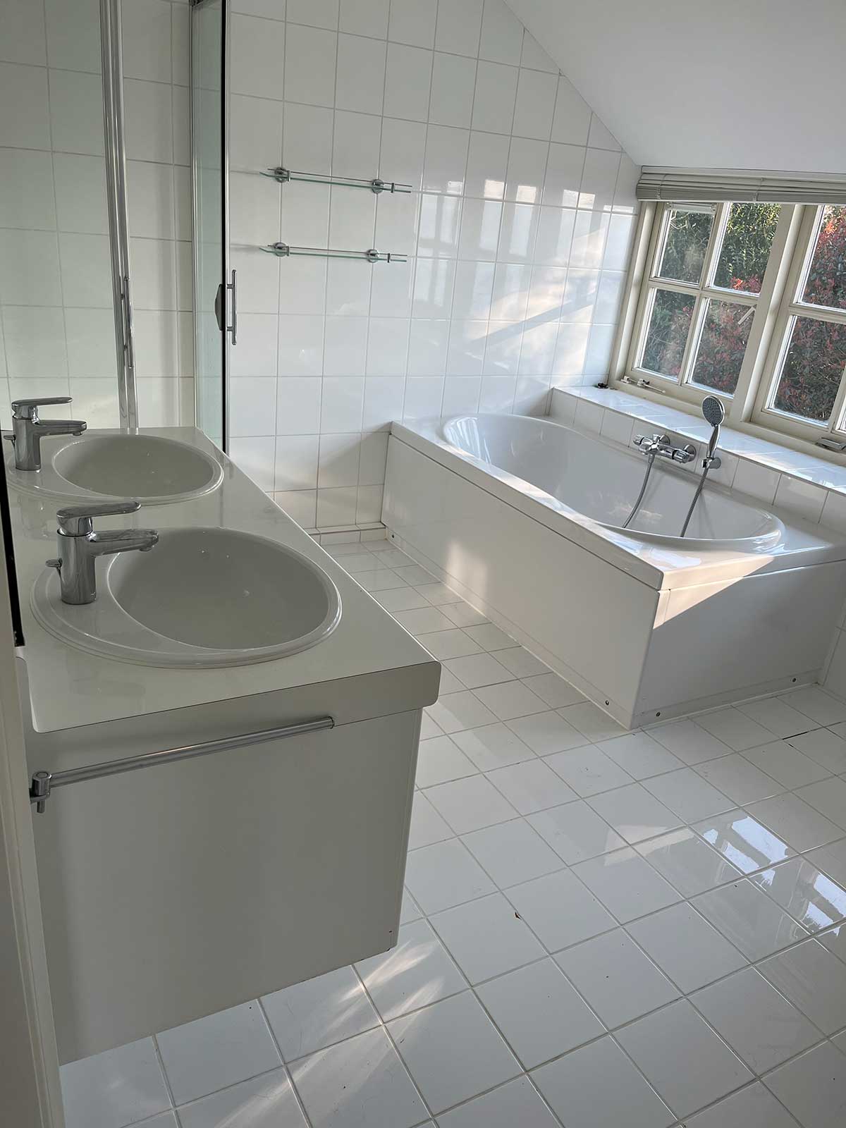 Badkamer gerenoveerd en vergroot, elektrische vloerverwarming en beton Cire op de vloer