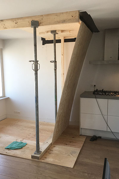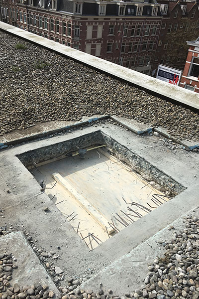 In een pand in Amsterdam heeft Kretex een gat in het dak aangebracht tbv een lichtkoepel.