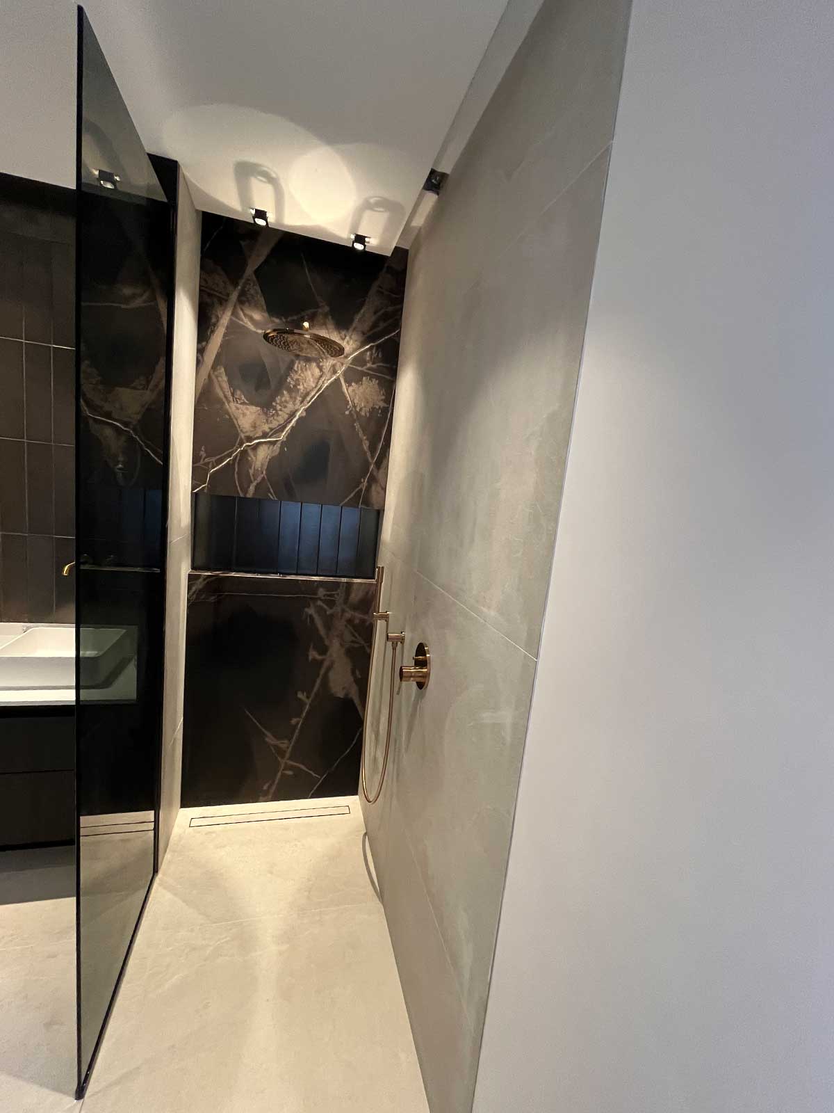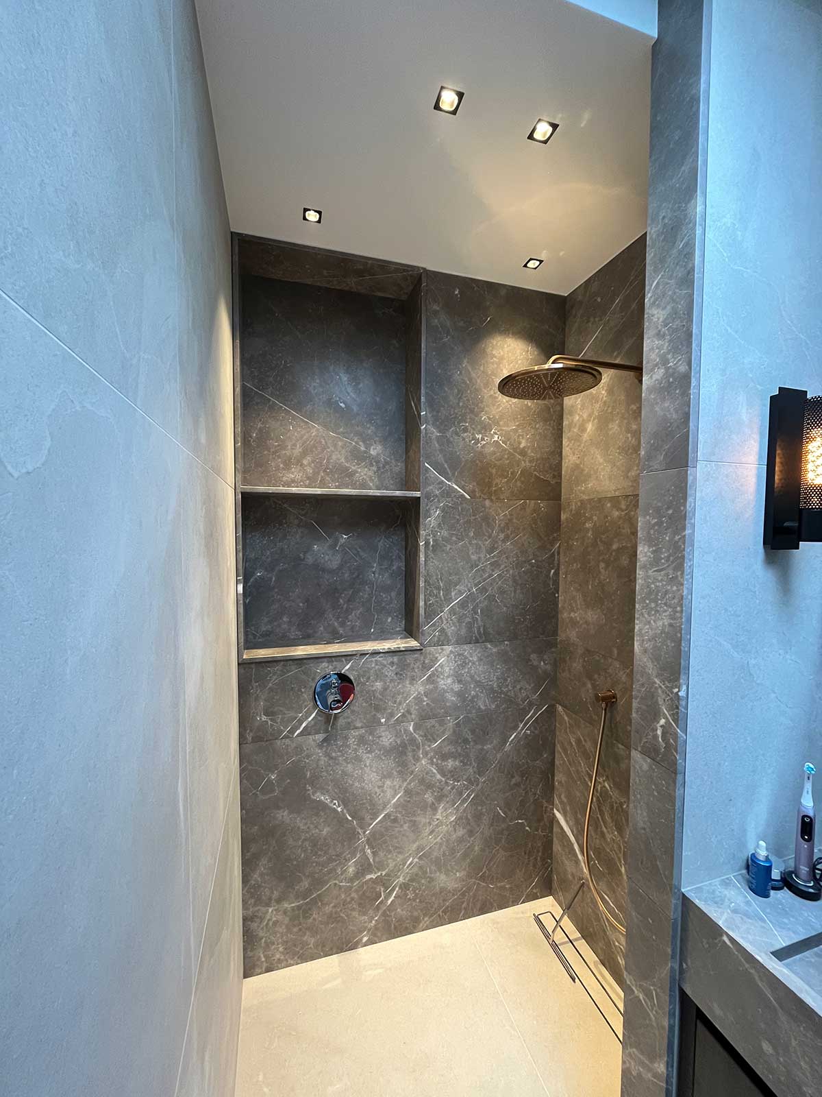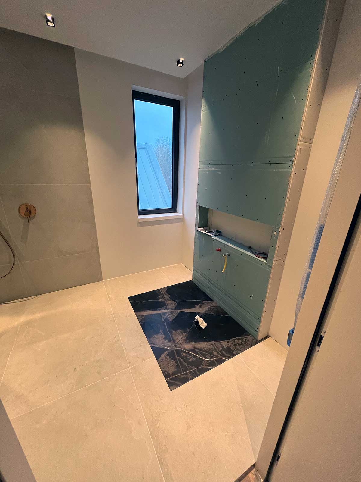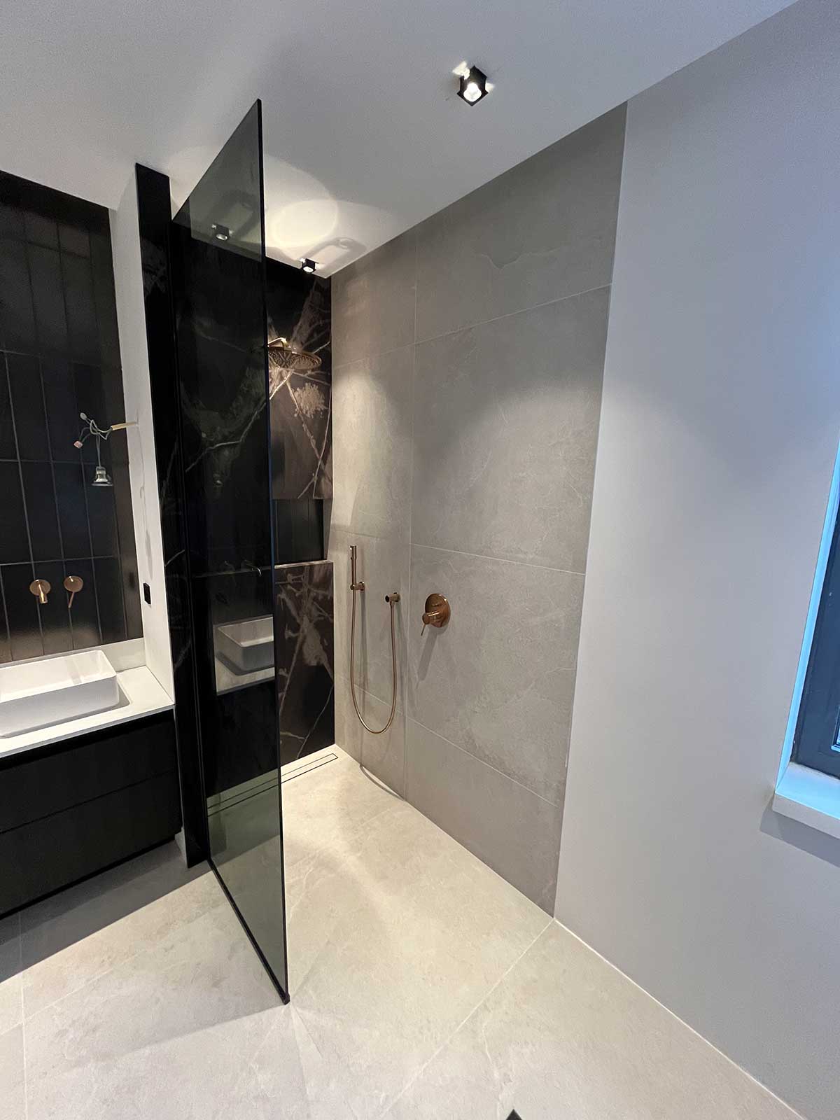 Twee badkamers vernieuwd, tegels afmeting 90 x 90 cm in combinatie met natuursteen