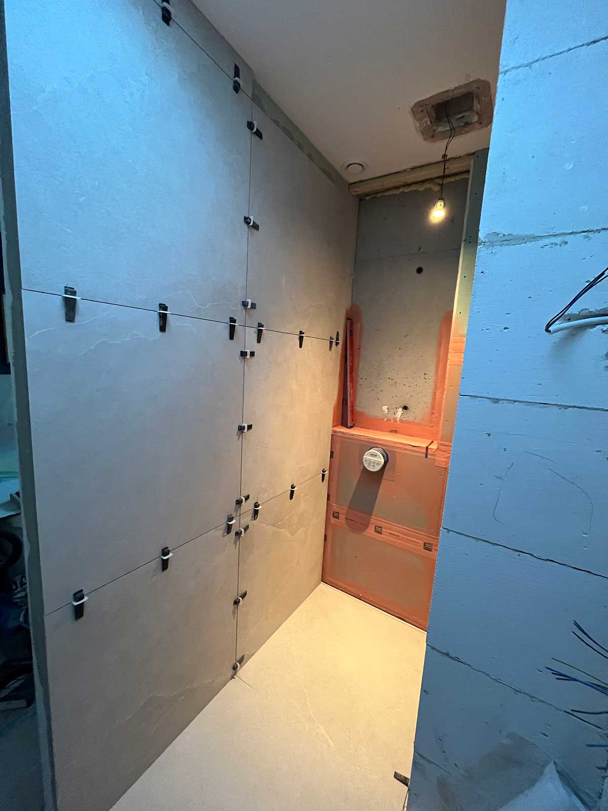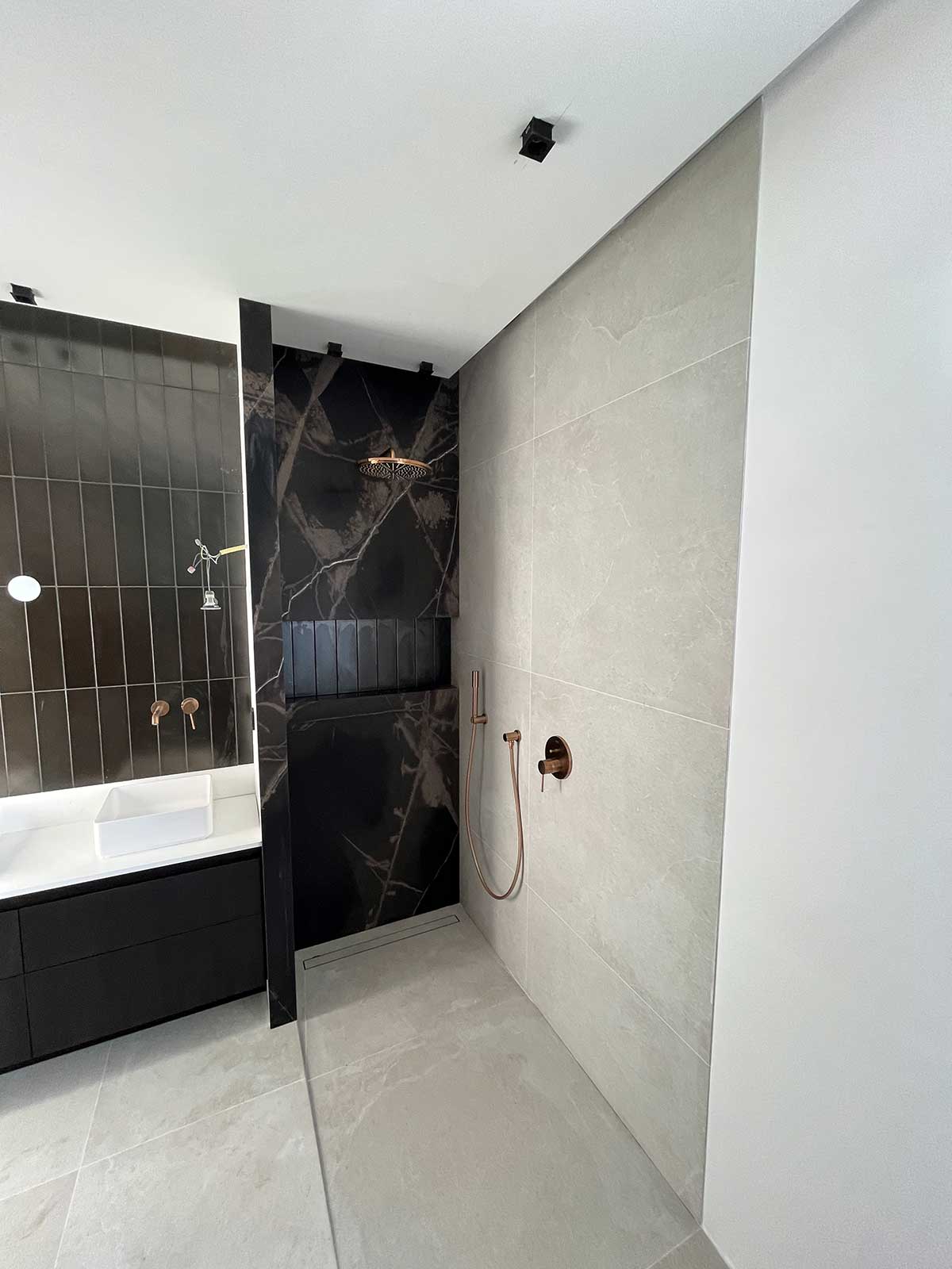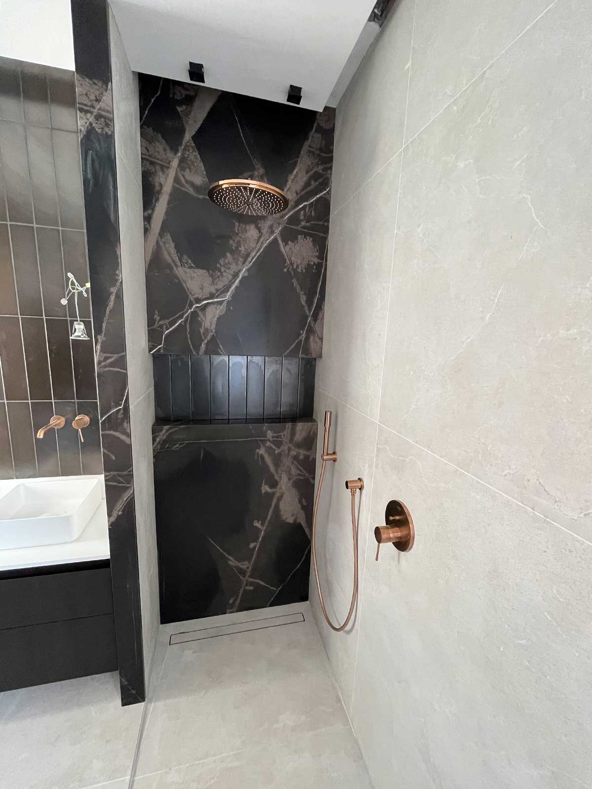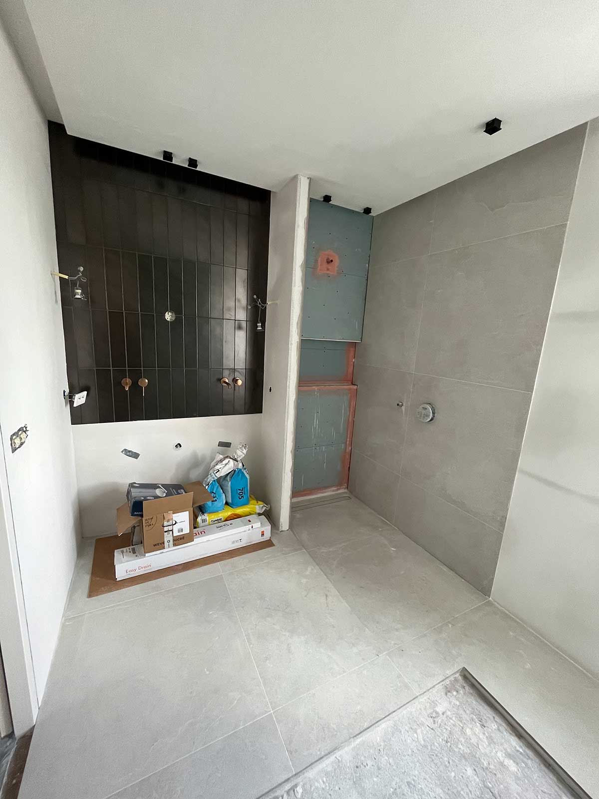 Twee badkamers vernieuwd, tegels afmeting 90 x 90 cm in combinatie met natuursteen
