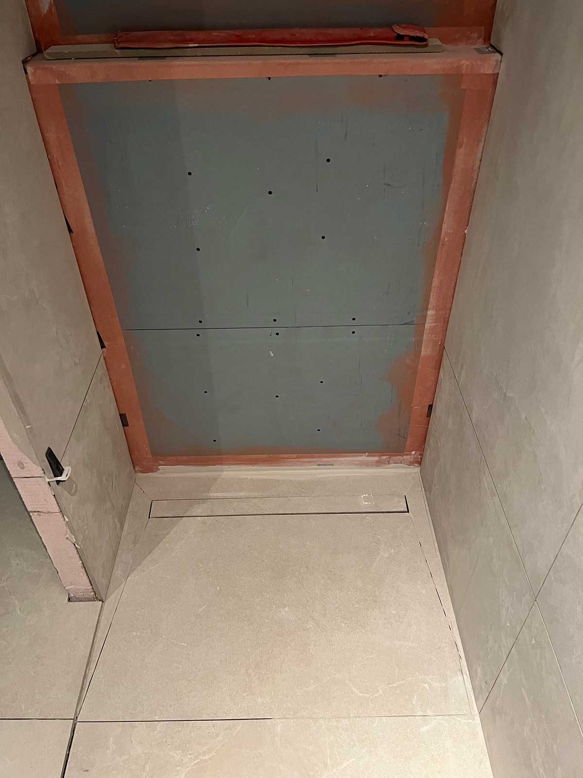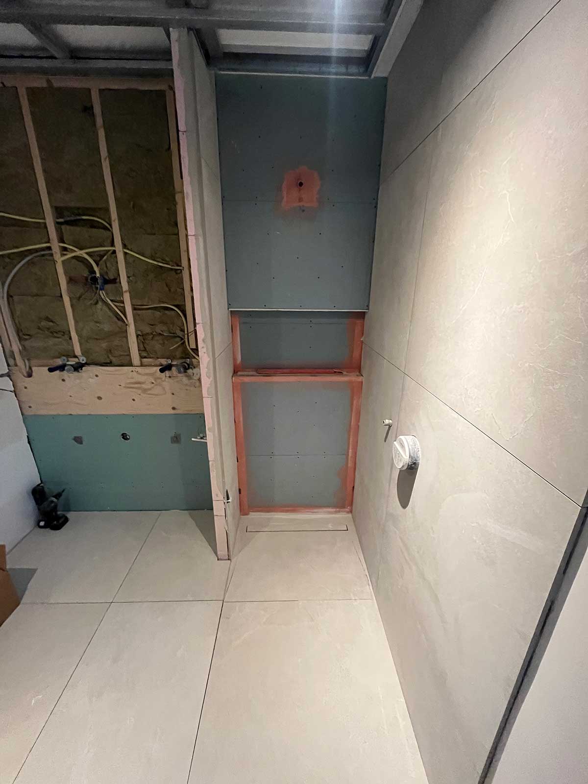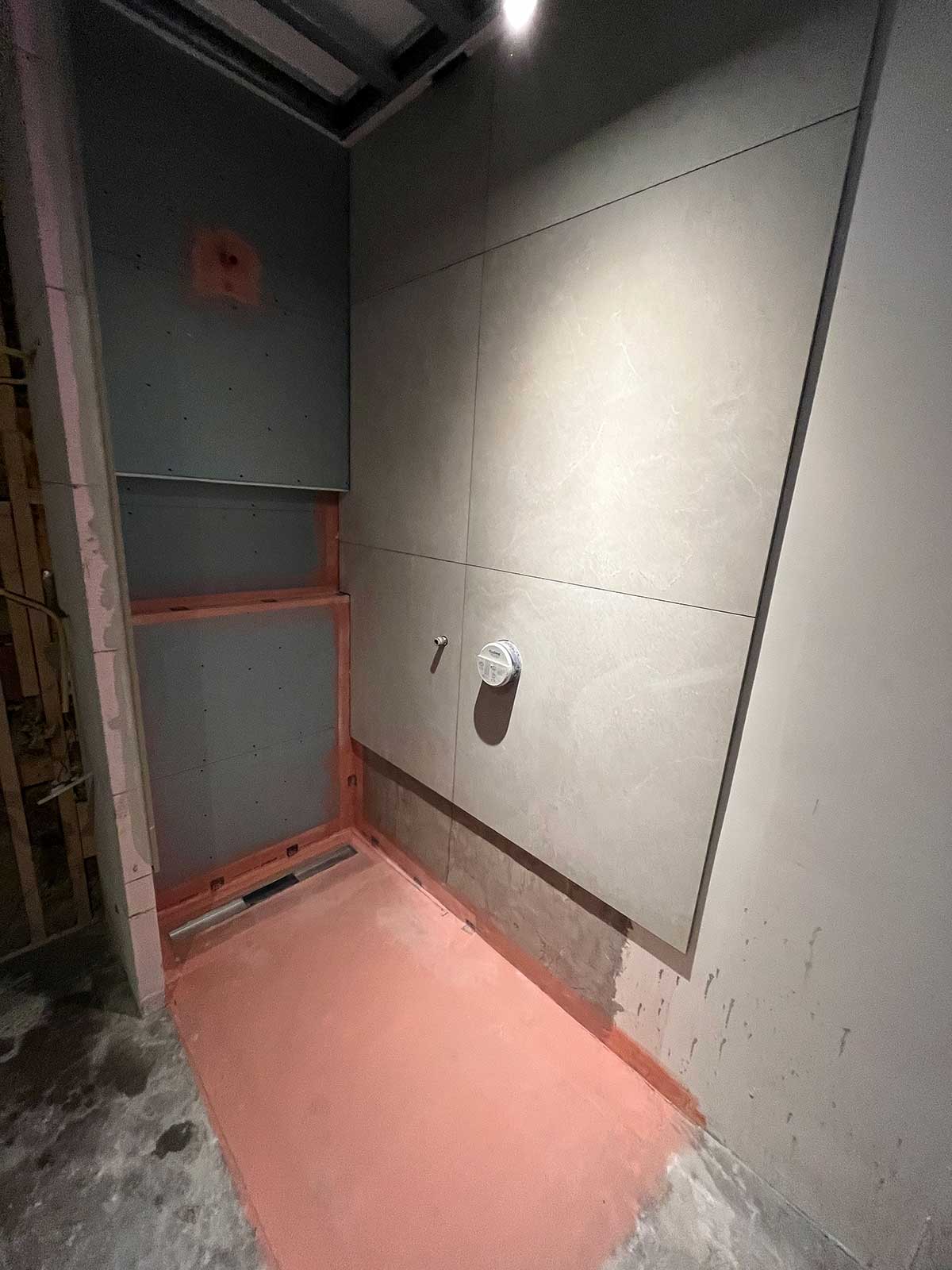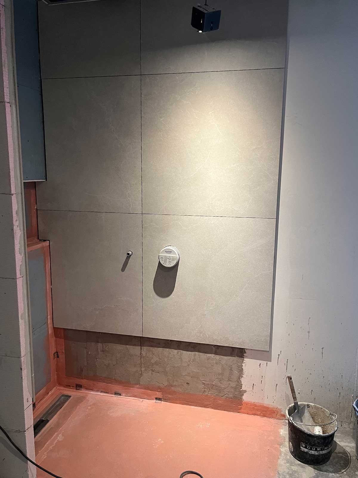 Twee badkamers vernieuwd, tegels afmeting 90 x 90 cm in combinatie met natuursteen