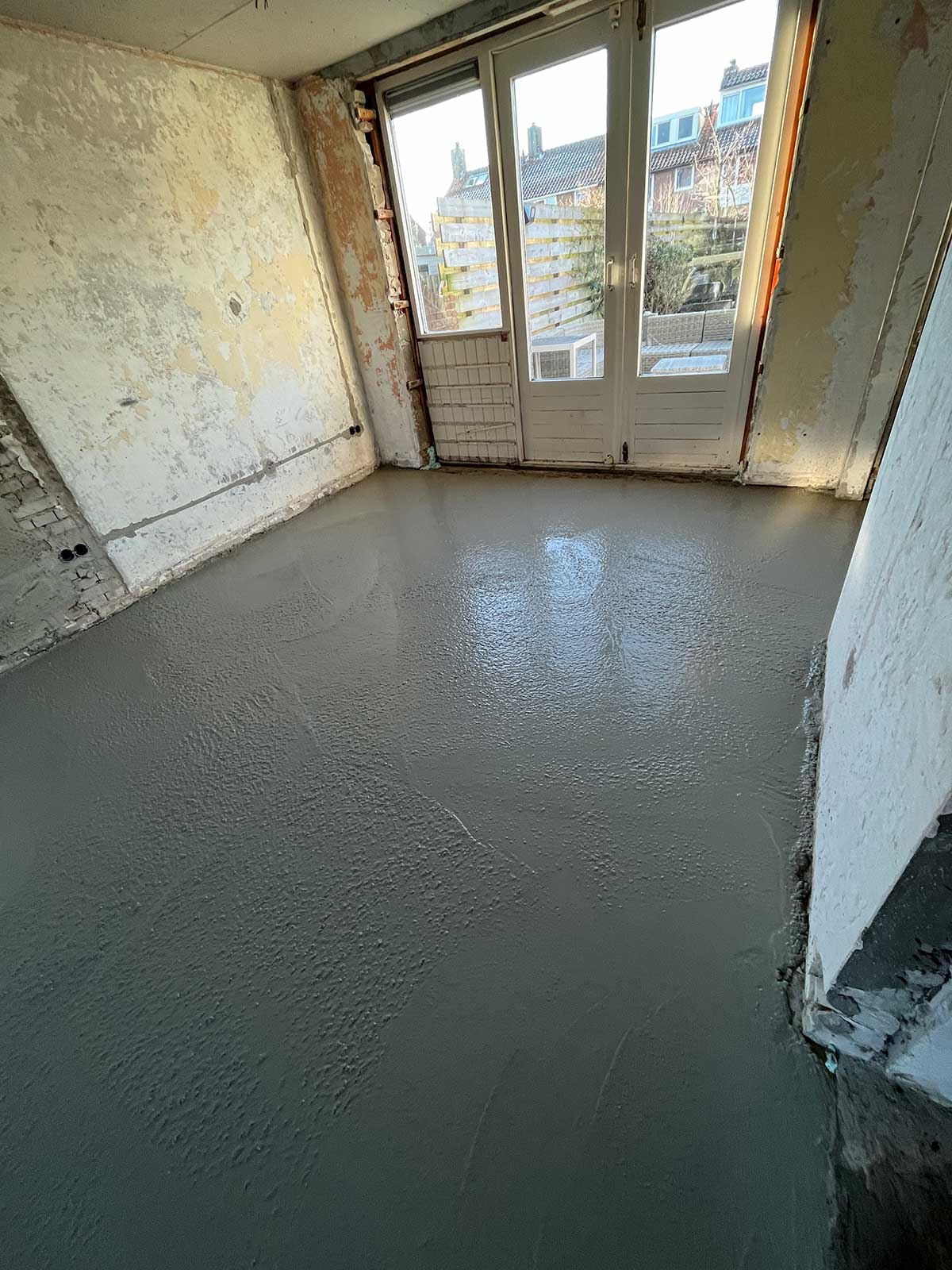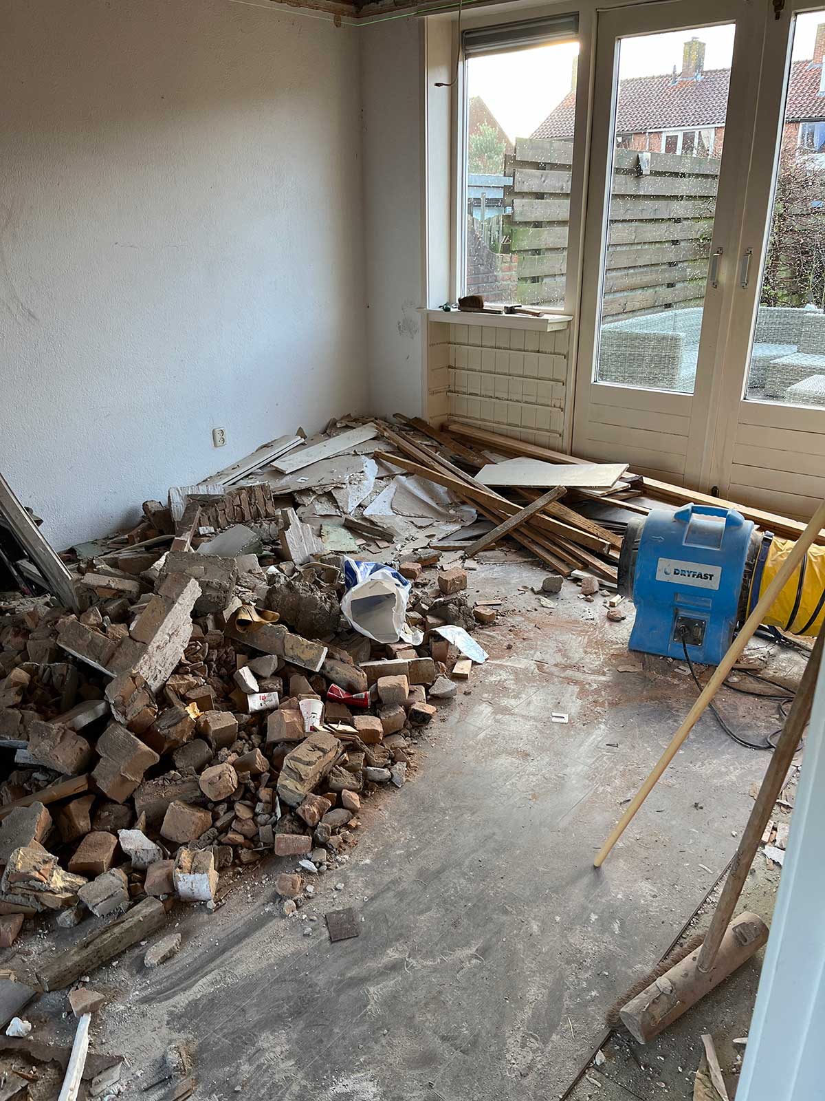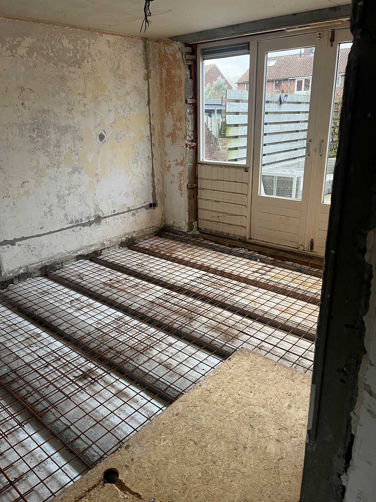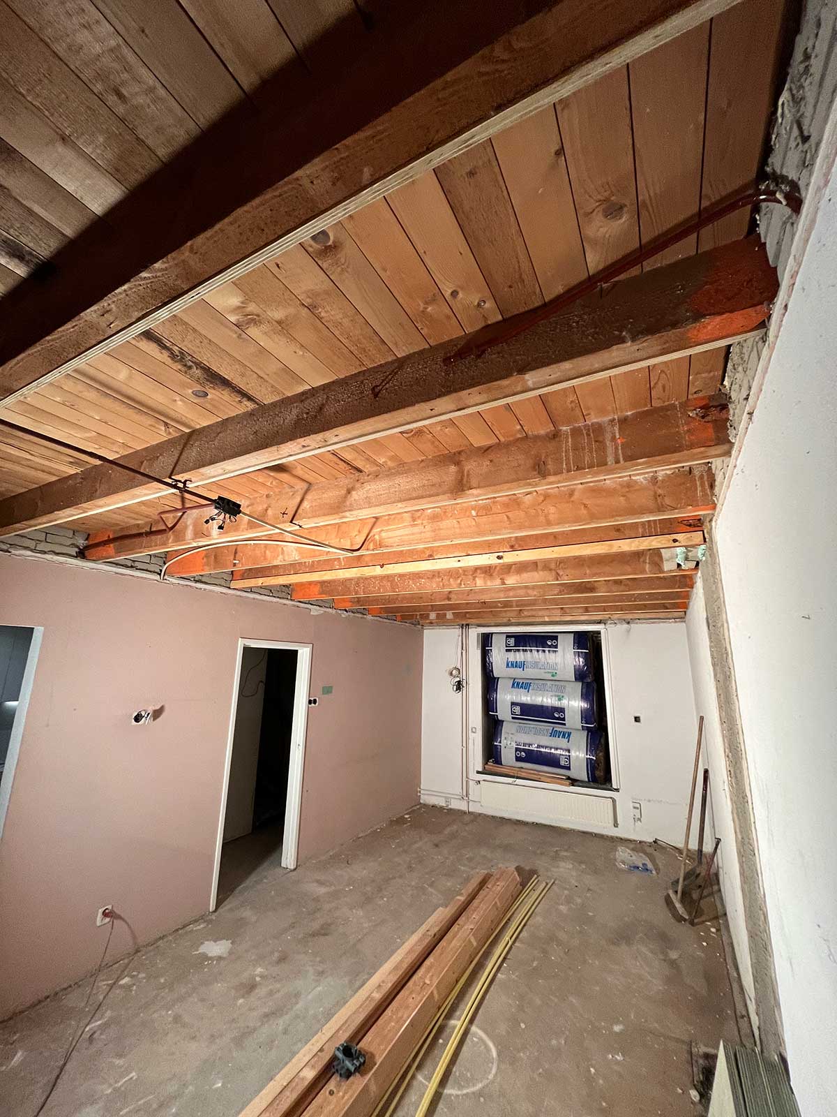 Vloer, plafond en ramen gesloopt. Geïsoleerde vloer met vloerverwarming en zandcementvloeren aangebracht. Elektra aangepast, nieuwe kozijnen geplaatst en alles gestuct.