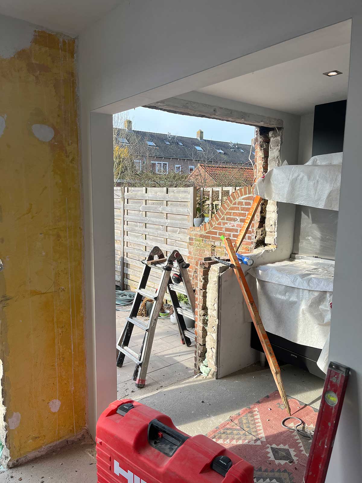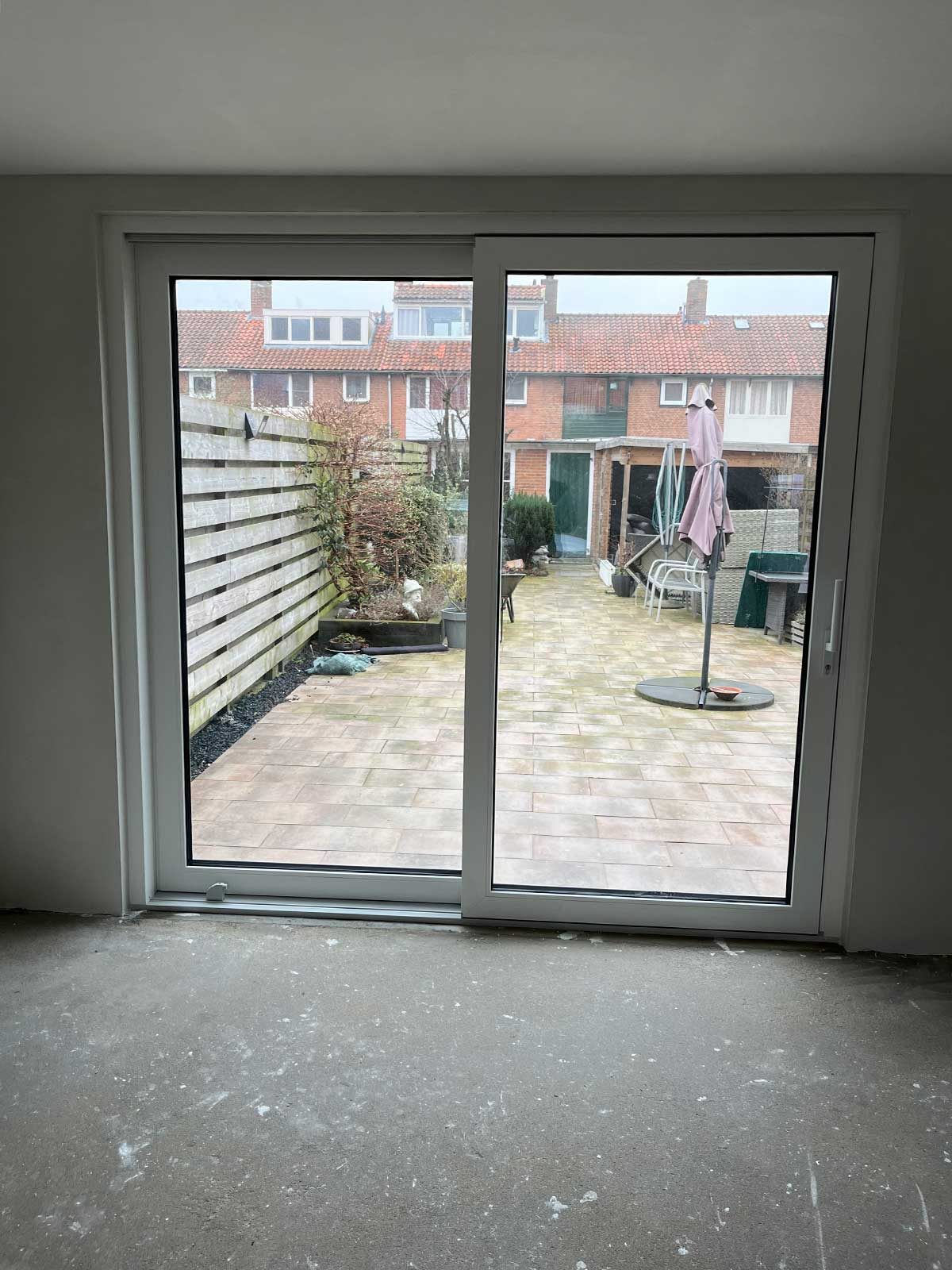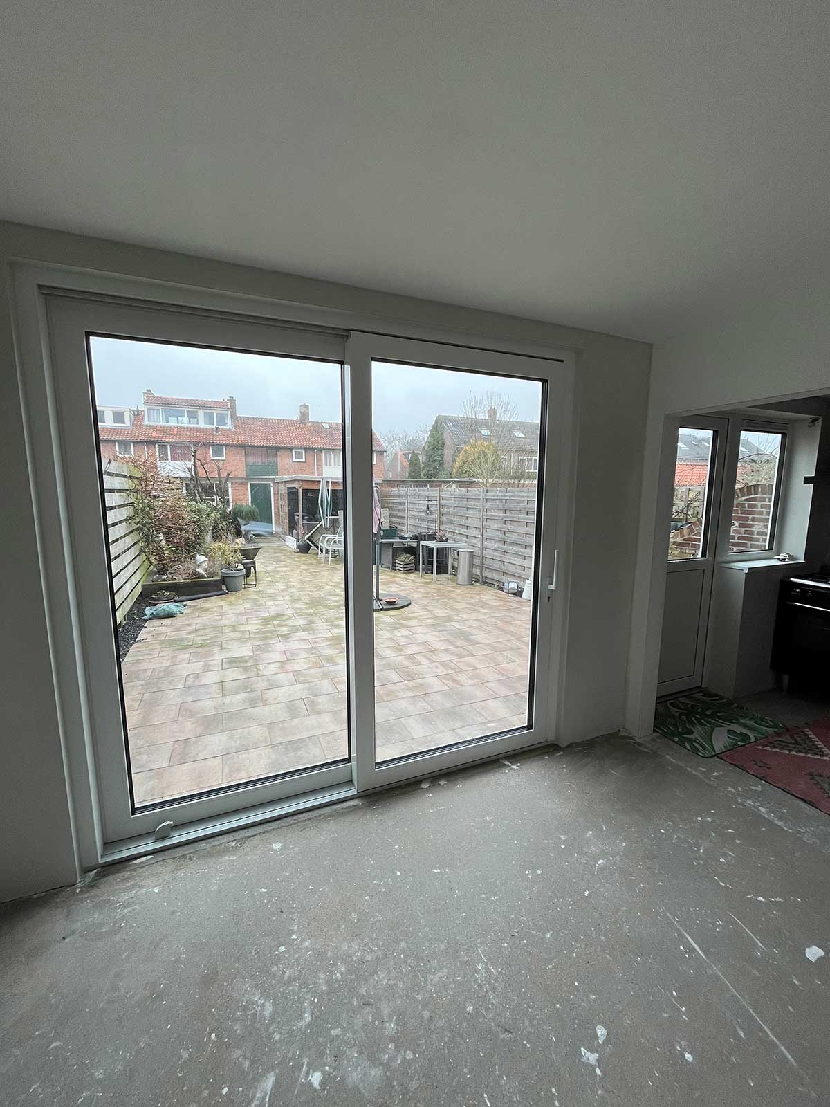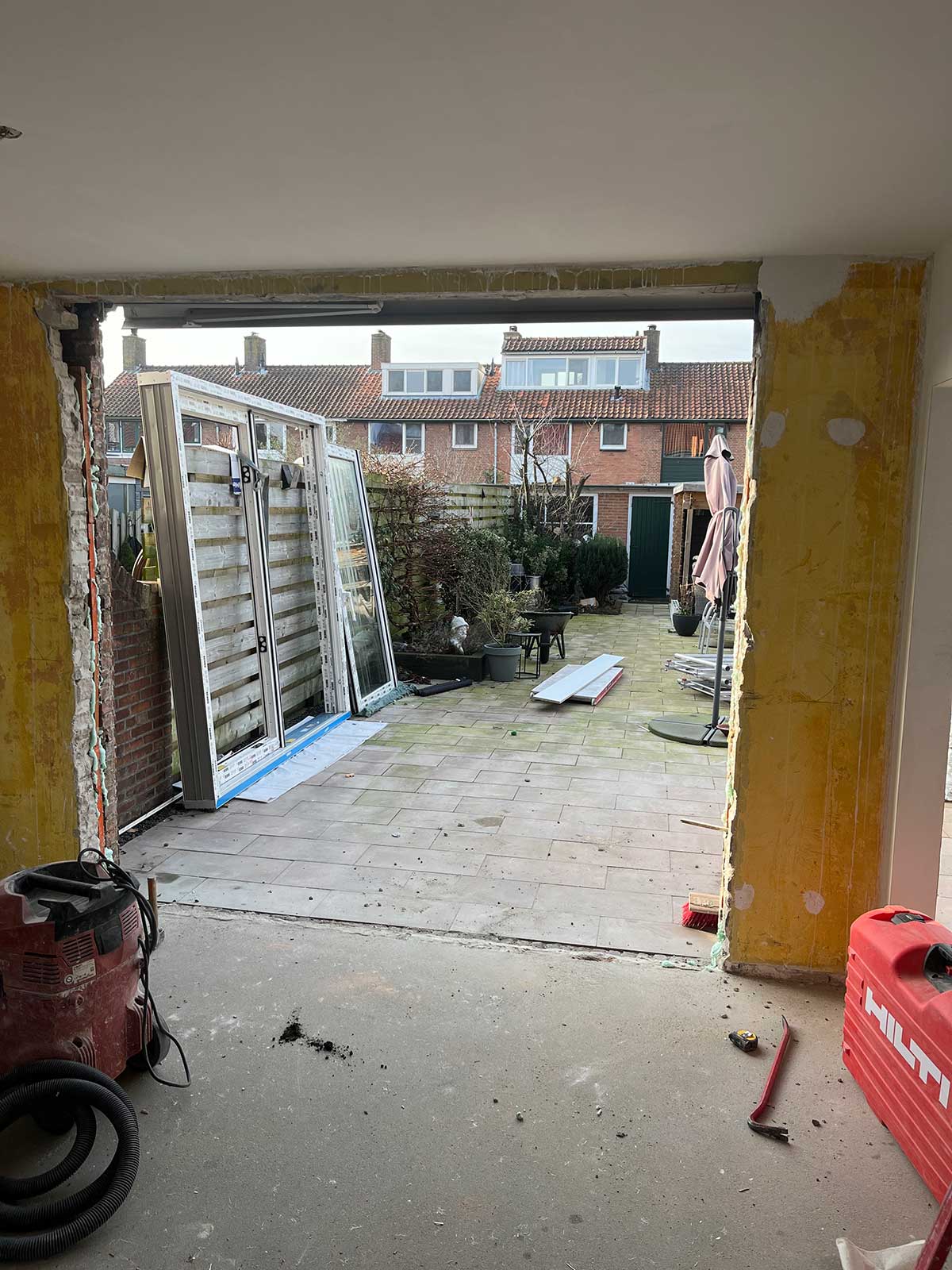 Vloer, plafond en ramen gesloopt. Geïsoleerde vloer met vloerverwarming en zandcementvloeren aangebracht. Elektra aangepast, nieuwe kozijnen geplaatst en alles gestuct.