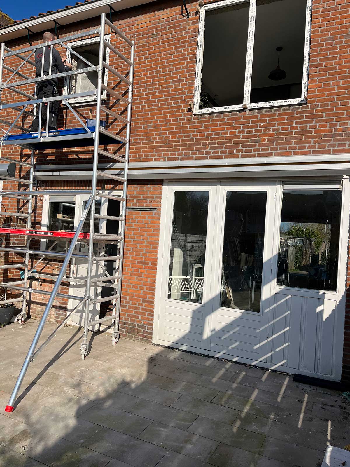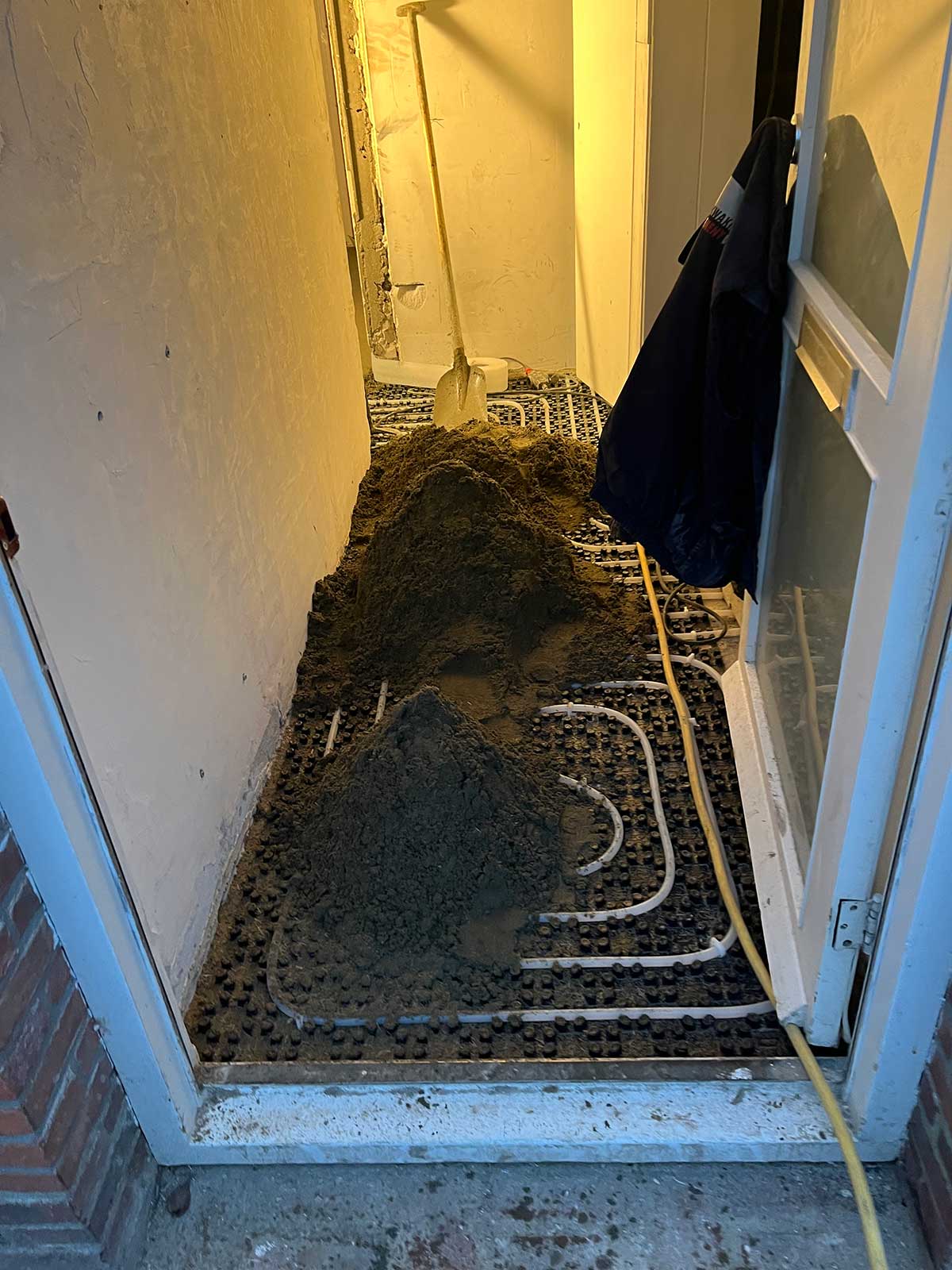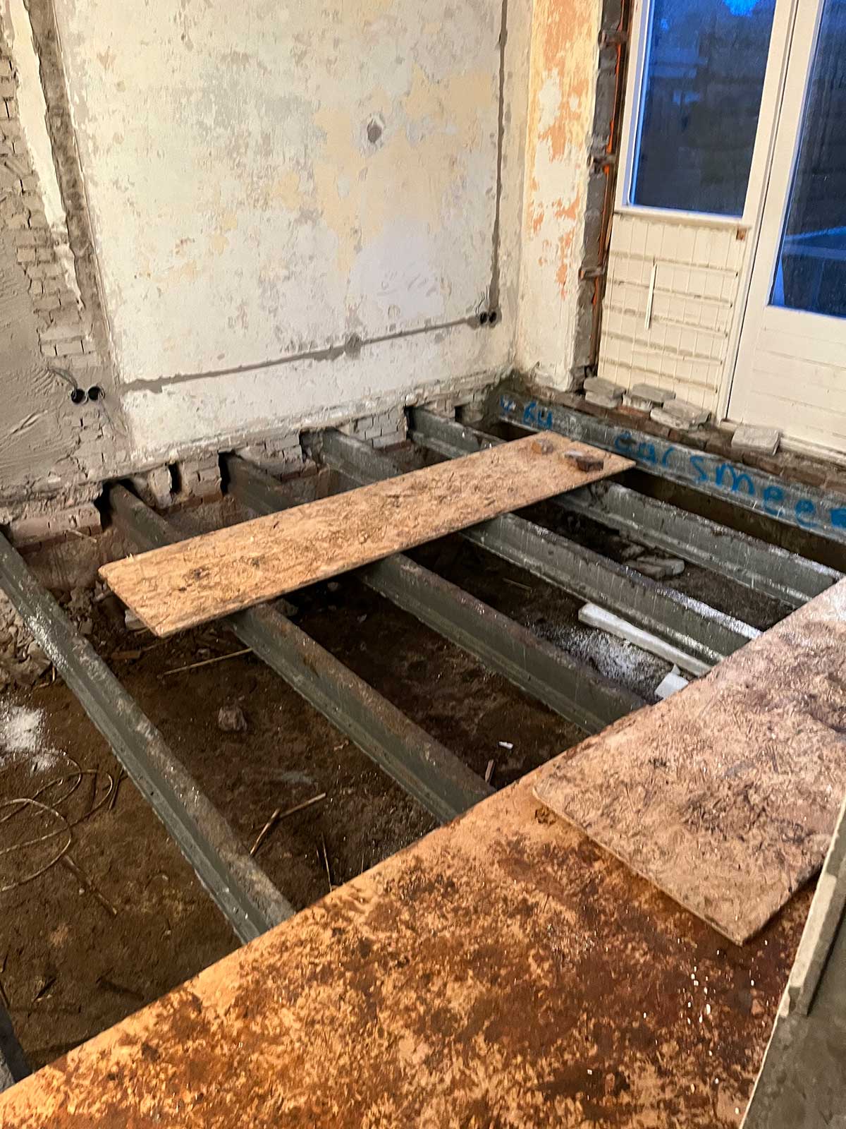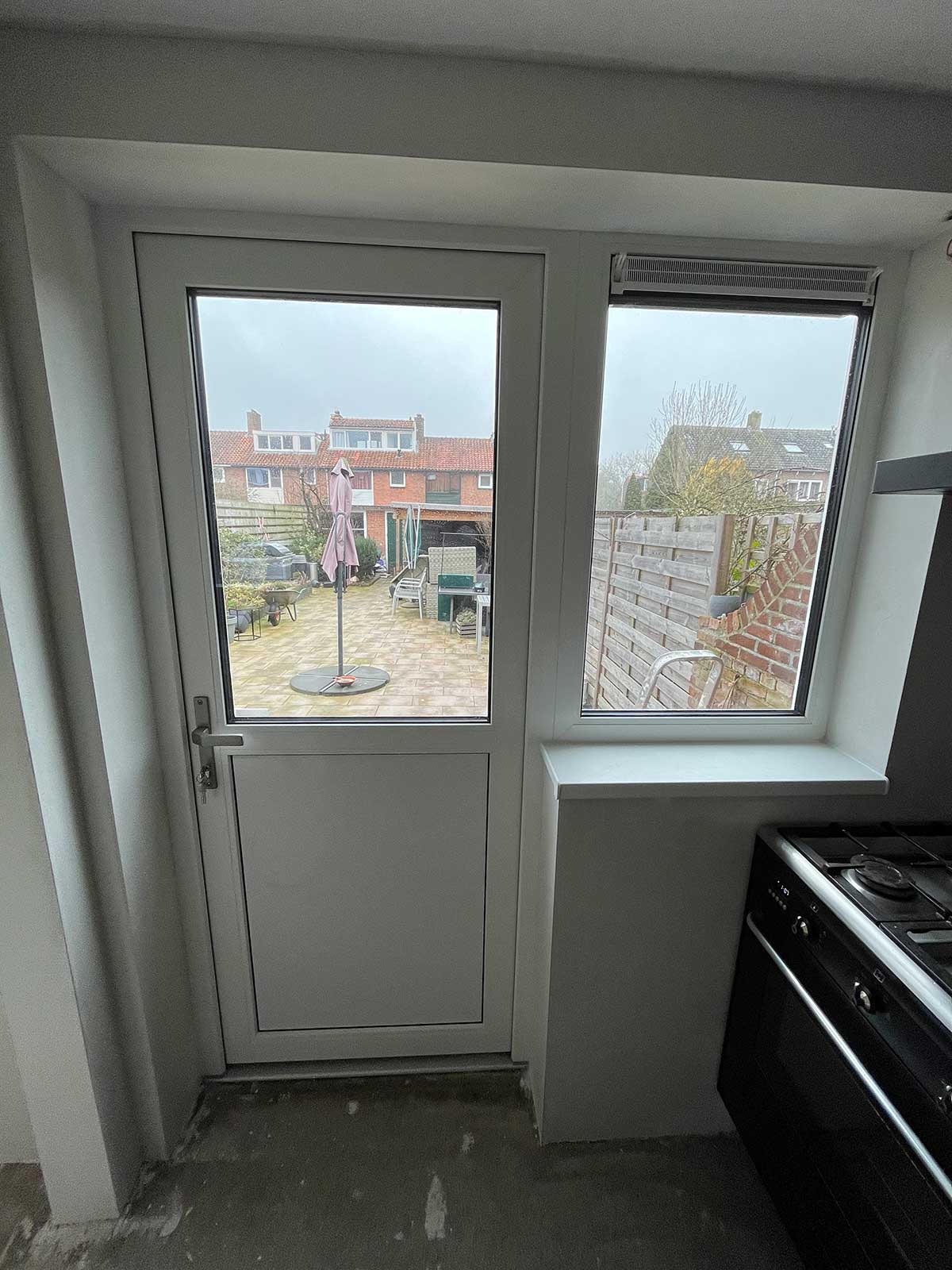 Vloer, plafond en ramen gesloopt. Geïsoleerde vloer met vloerverwarming en zandcementvloeren aangebracht. Elektra aangepast, nieuwe kozijnen geplaatst en alles gestuct.